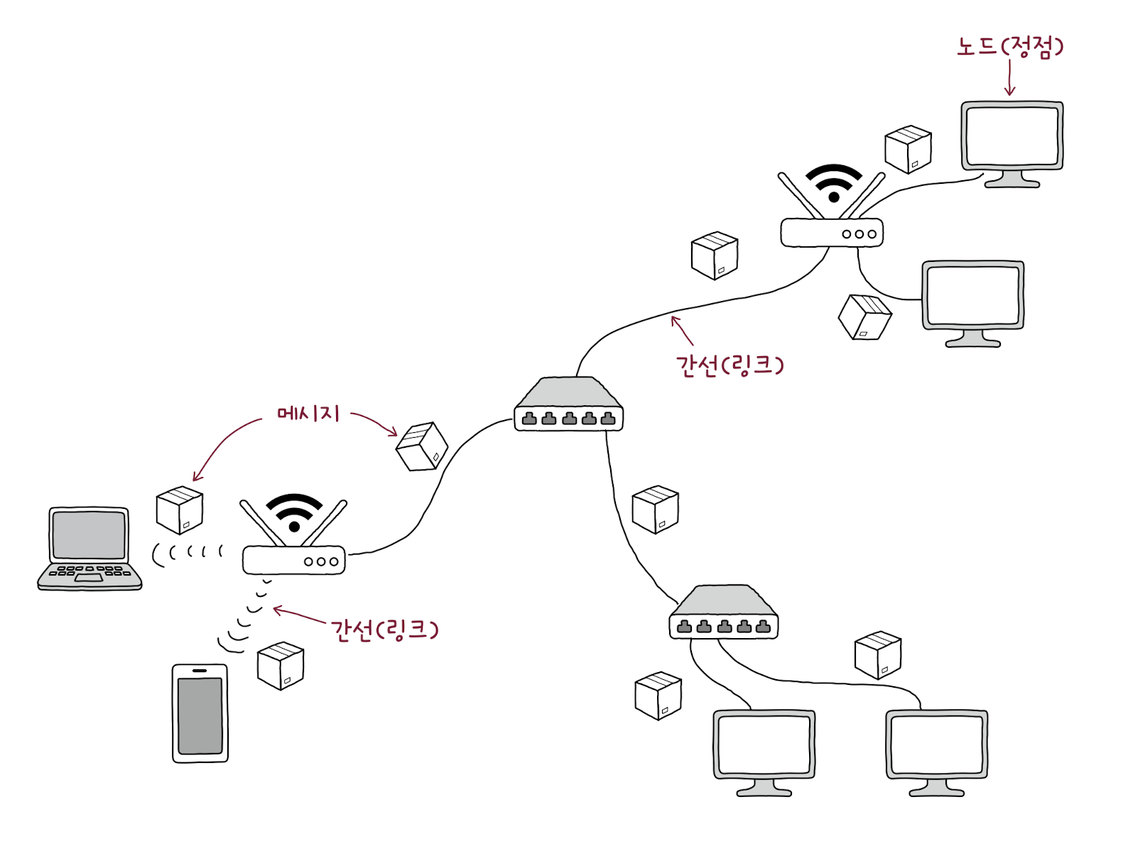 모든 네트워크는 노드, 노드를 연결하는 간선, 노드 간 주고 받는 메시지로 구성된다.