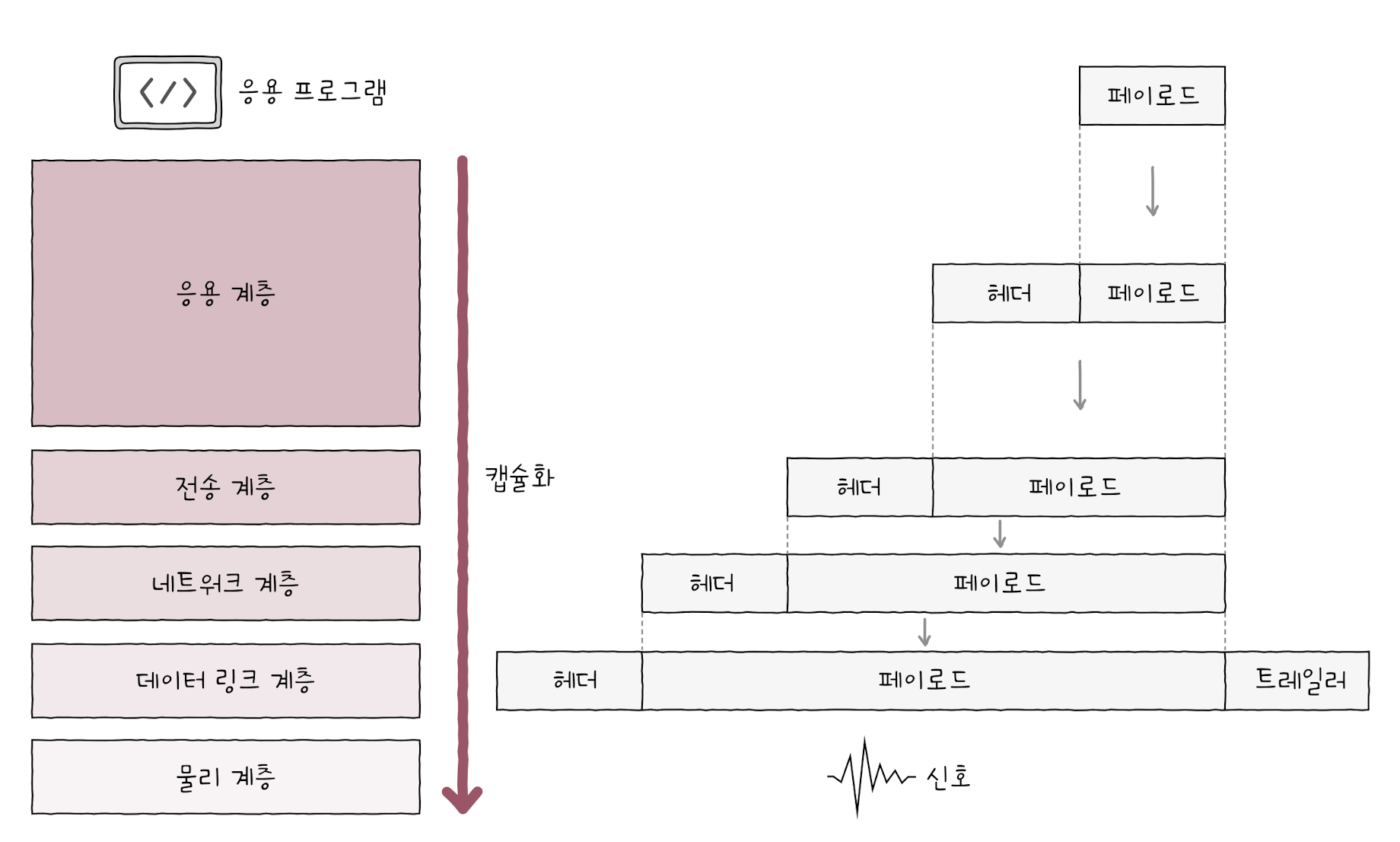 즉, 한 단계 아래 계층은 바로 위의 계층으로부터 받은 패킷에 헤더 및 트레일러를 추가해 나간다.