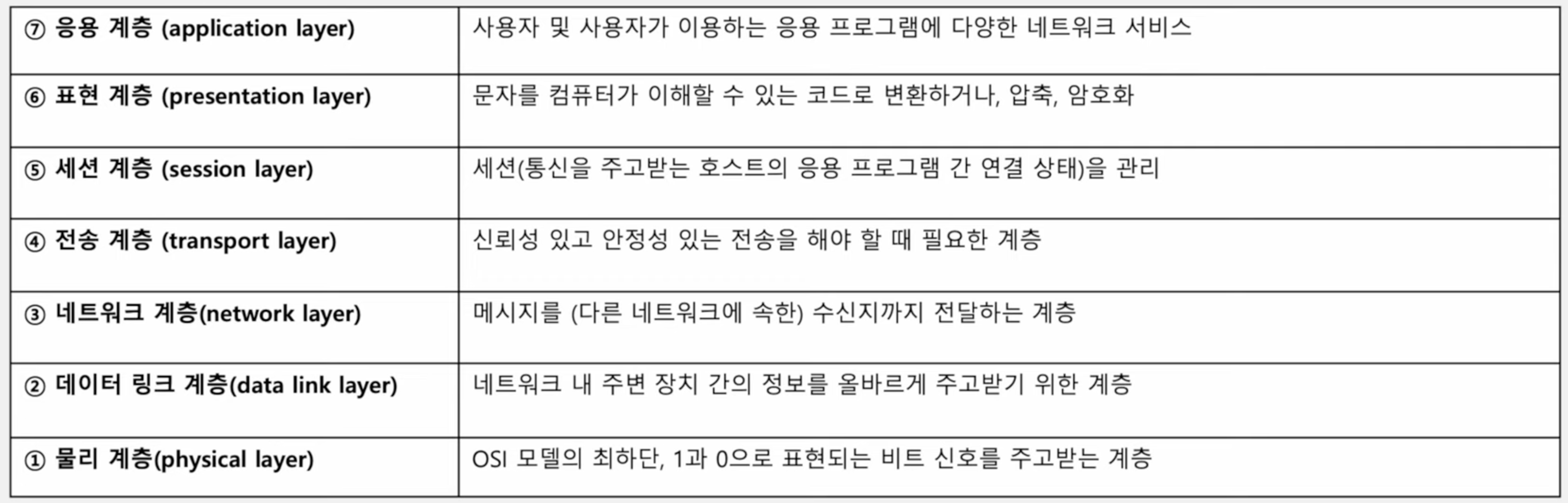 - 통신 단계를 7개의 계층으로 나누는데, 최하위 계층에서 최상위 계층순으로 각각 물리, 데이터 링크, 네트워크, 전송, 세션, 표현, 응용 계층이다.