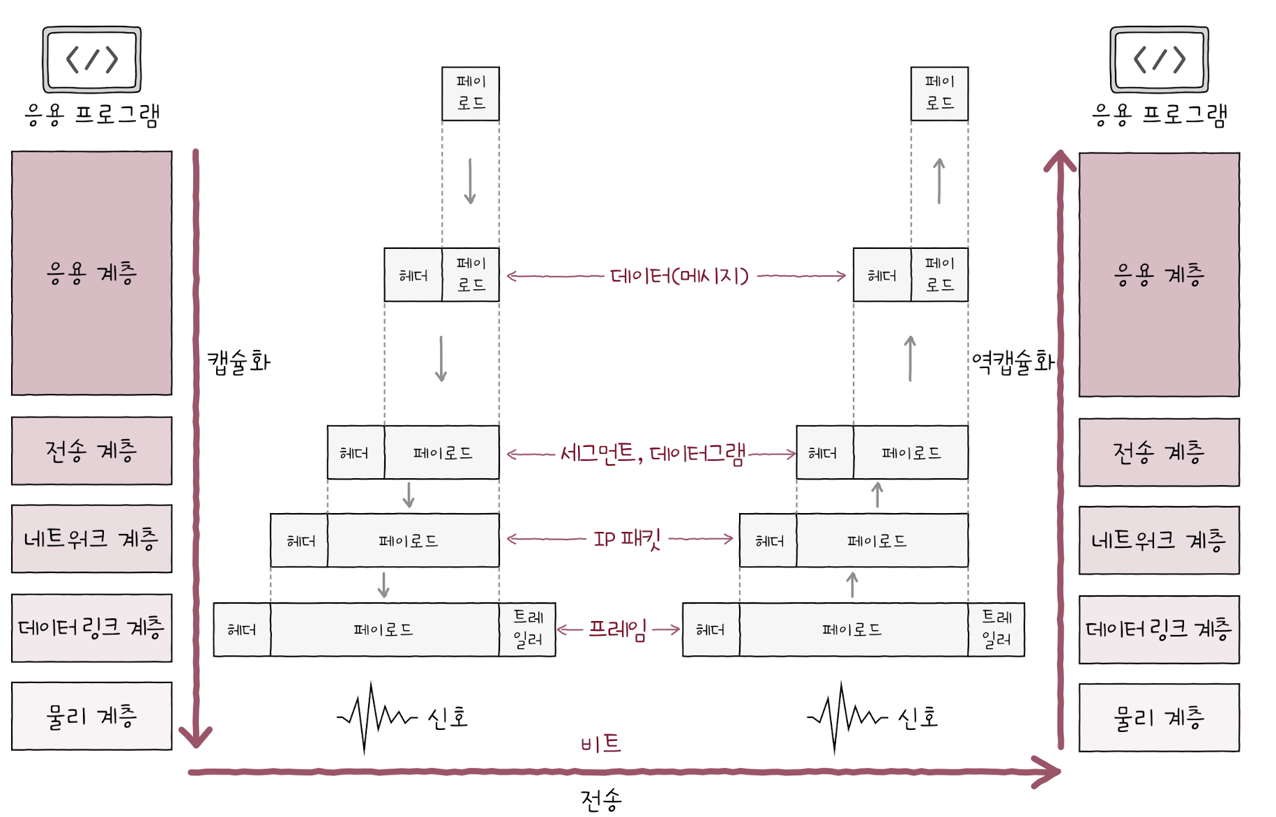 - 송수신하는 메시지는 송신지 입장에서는 가장 높은 계층에서부터 가장 낮은 계층으로 이동하고, 수신지 입장에서는 가장 낮은 계층에서부터 가장 높은 계층으로 이동한다.