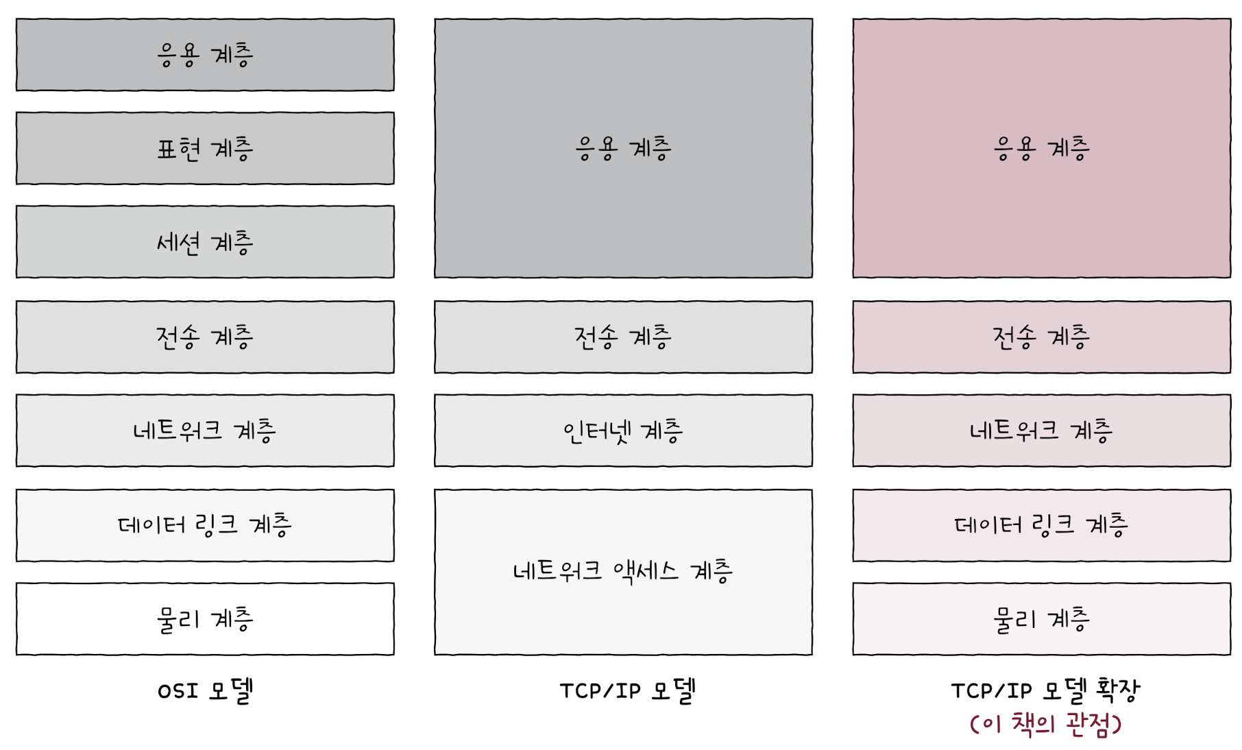 - 그래서 많은 공식 문서와 전공 서적에서는 OSI 모델과 TCP/IP 모델을 대응하여 설명하기 위햇 TCP/IP 모델에 물리 계층을 추가해 TCP/IP 모델을 5계층으로 확장하여 기술하기도 한다.
