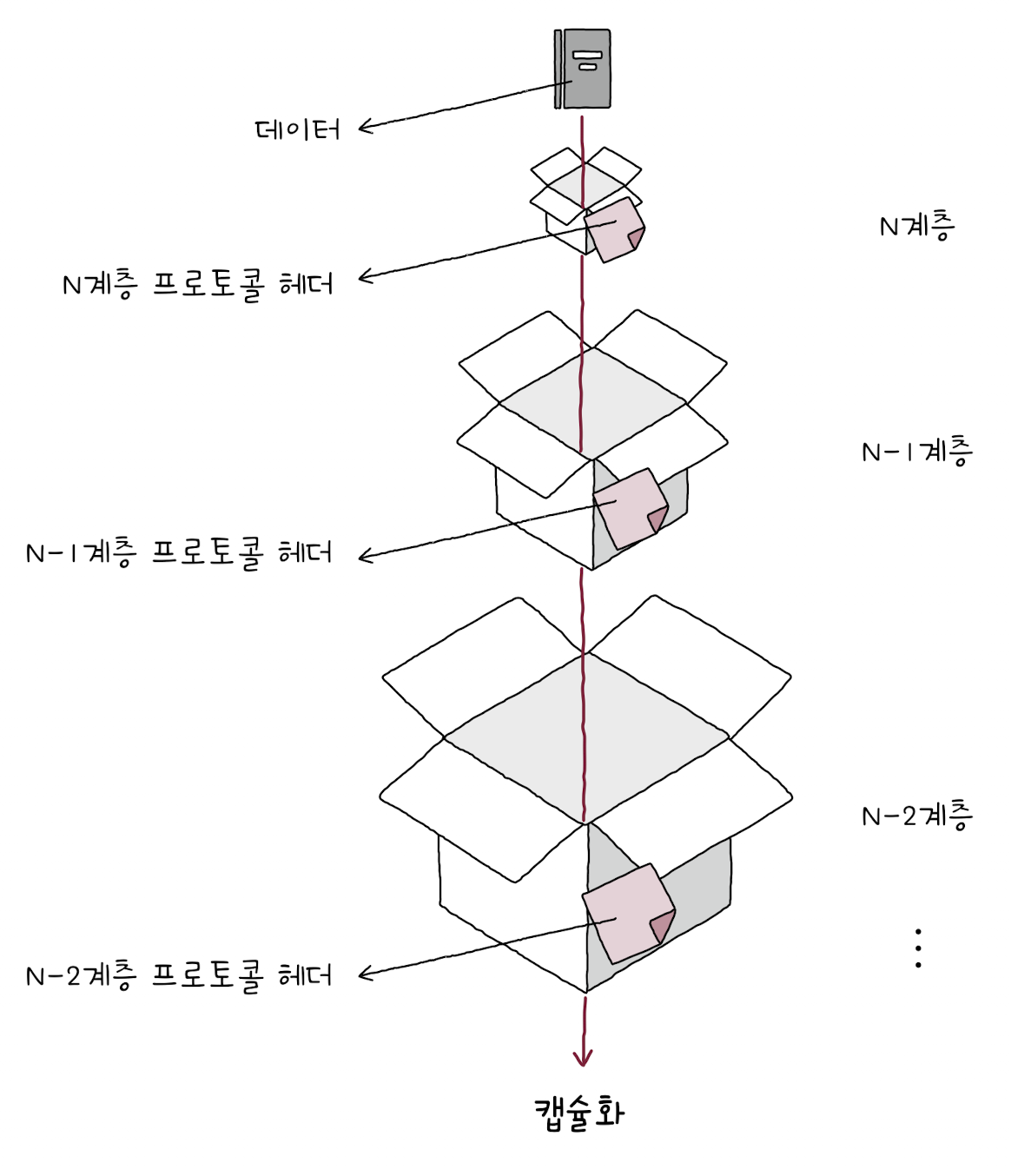 어떤 정보를 송신할 때 각 계층에서 상위 계층으로부터 내려받은 패킷을 페이로드로 삼아, 프로토콜에 걸맞은 헤더(혹은 트레일러)를 덧붙인 후 하위 계층으로 전달한다.