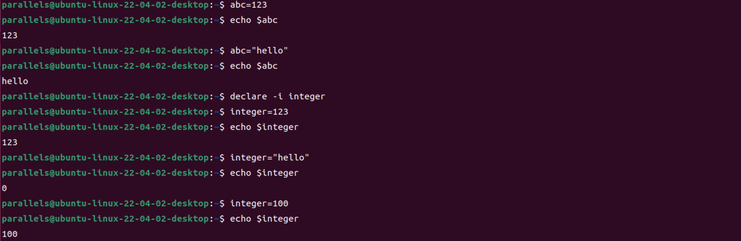 하지만 declare 명령어를 통해서 정수 타입, 배열 타입 변수를 선언할 수 있다.