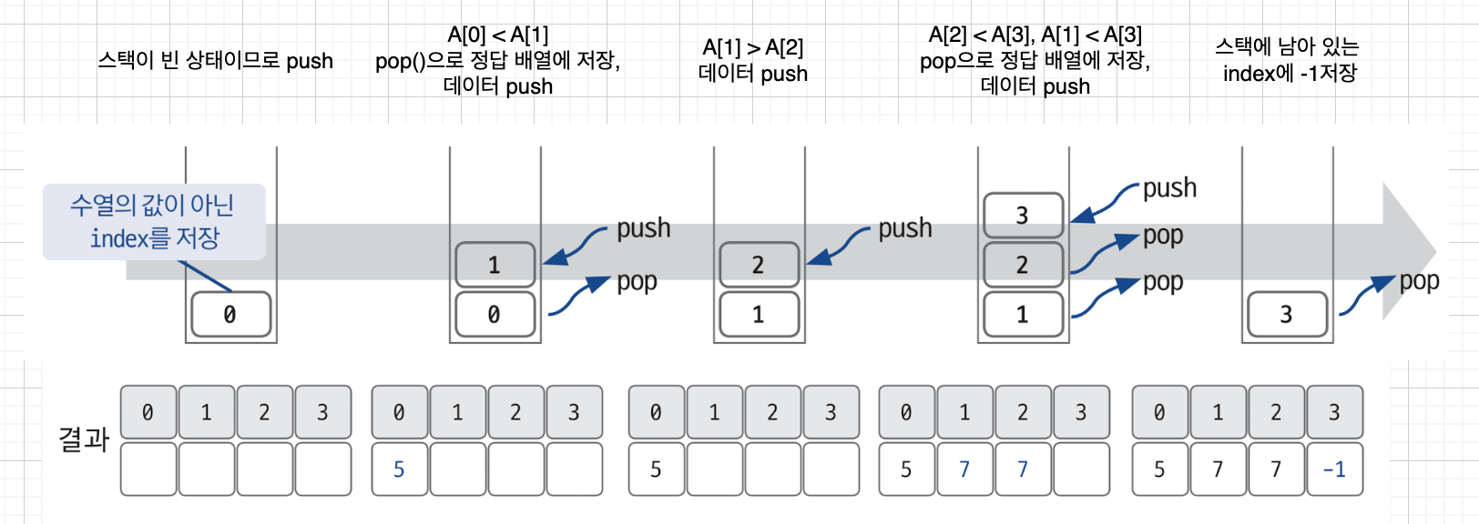 | 최종 | - | - | [] | [5,7,7,-1] | 남은 스택 원소 -1로 처리 |