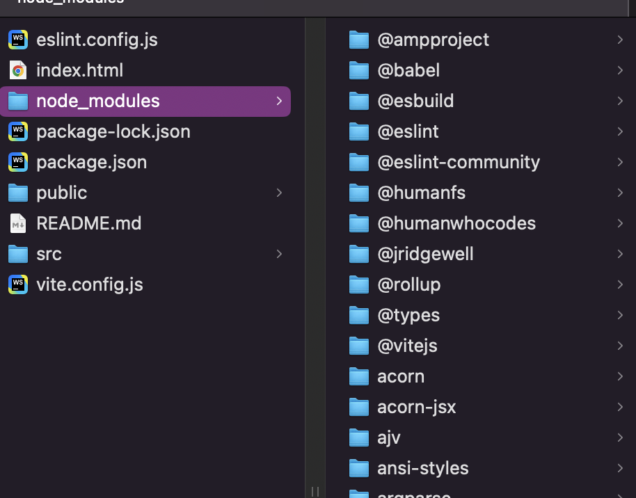 완료가 되었다면 아래와 같이 node_modules 라는 폴더가 생성되어있고, 안에 라이브러리들이 다운로드되어있는 것을 확인할 수 있다.