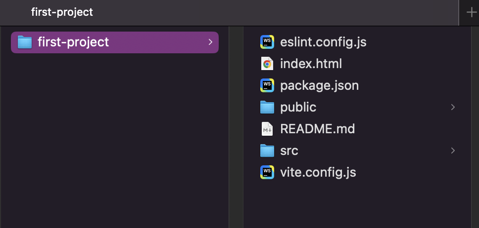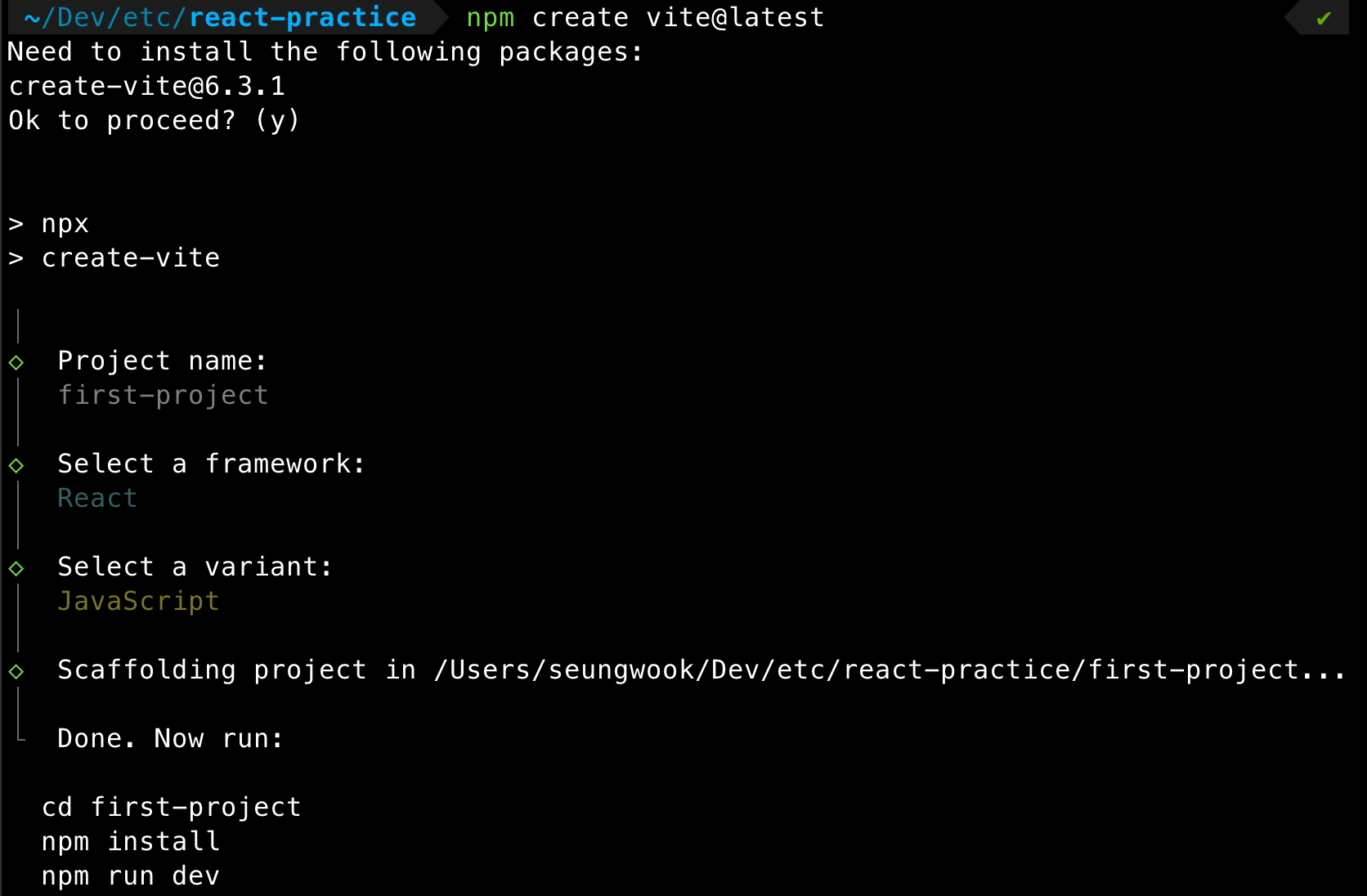 - --template react: vite의 템플릿 옵션, react 템플릿을 사용하겠다는 의미, 다른 옵션들: react-ts(TypeScript), vue, vanilla 등