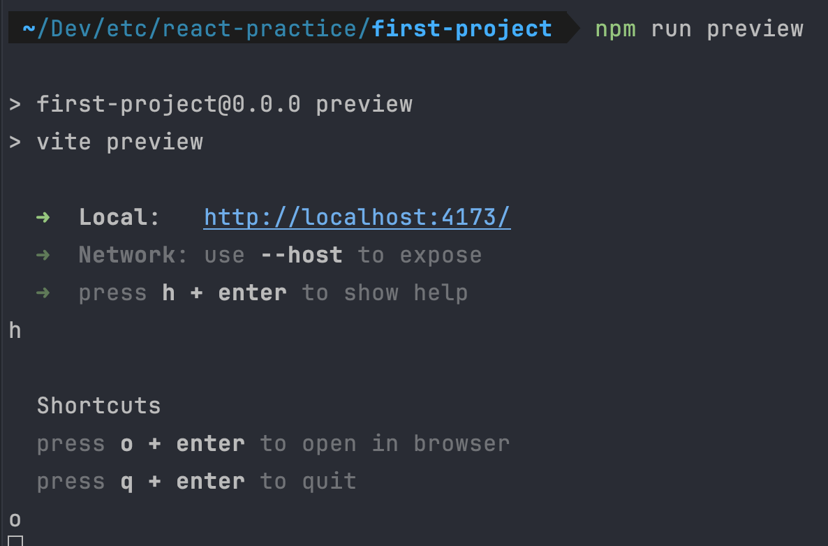 - npm run preview: 빌드 후 생성된 dist 폴더의 내용을 로컬에서 실행(기본 포트 4173)(빌드된 결과물 미리보기)