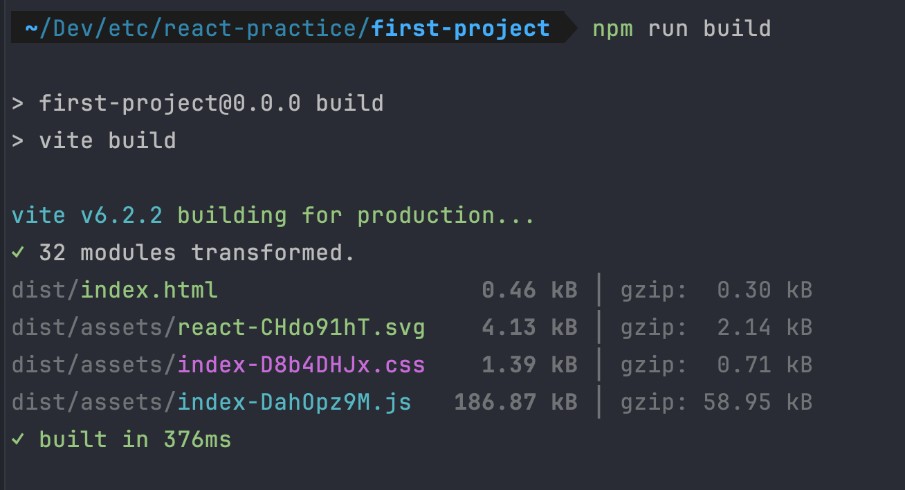 - npm run build: 코드를 최적화하여 배포용 파일 생성(프로덕션용 빌드)