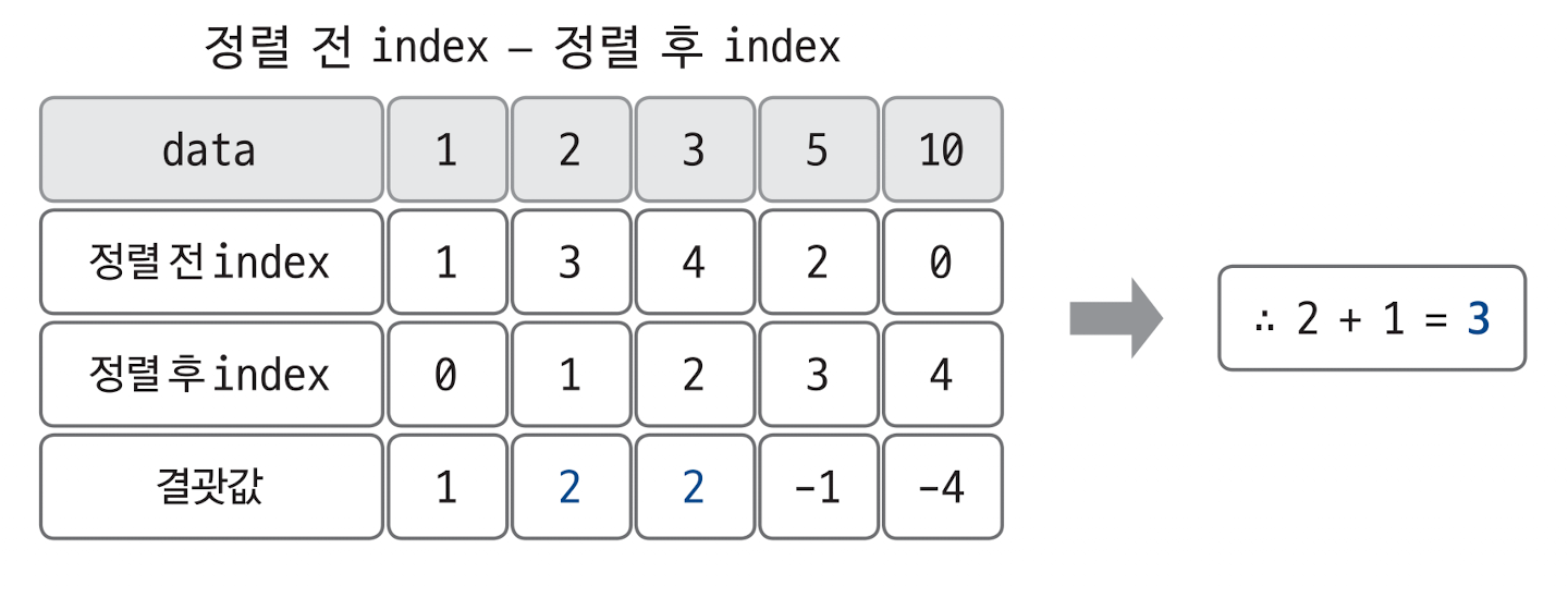 - 값을 기준으로 정렬한 후, 정렬 전 위치(index) - 정렬 후 위치(index) 차이를 확인한다.