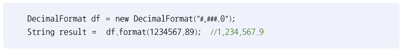 패턴 정보와 함께 DecimalFormat 객체를 생성하고 format() 메소드로 숫자를 제공하면 패턴에 따른 형식화된 문자열을 얻을 수 있다.