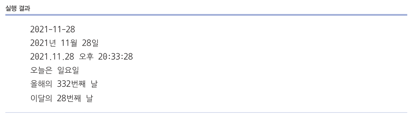 패턴 정보와 함께 SimpleDateFormat 객체를 생성하고 format() 메소드로 날짜를 제공하면 패턴과 동일한 문자열을 얻을 수 있다.