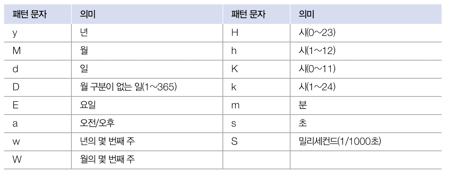 예를 들어 yyyy는 년도를 4자리로, MM과 dd는 각각 월과 일을 2자리로 표시하라는 의미이다.