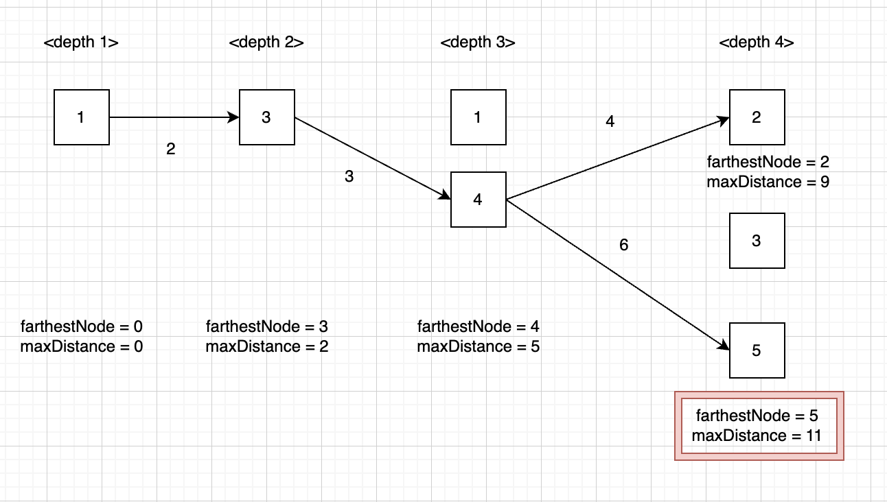 이후 같은 방법으로 노드 5에서부터 가장 먼거리를 탐색하면 노드 1이고, 노드 5와 노드 1간의 거리는 11이다.