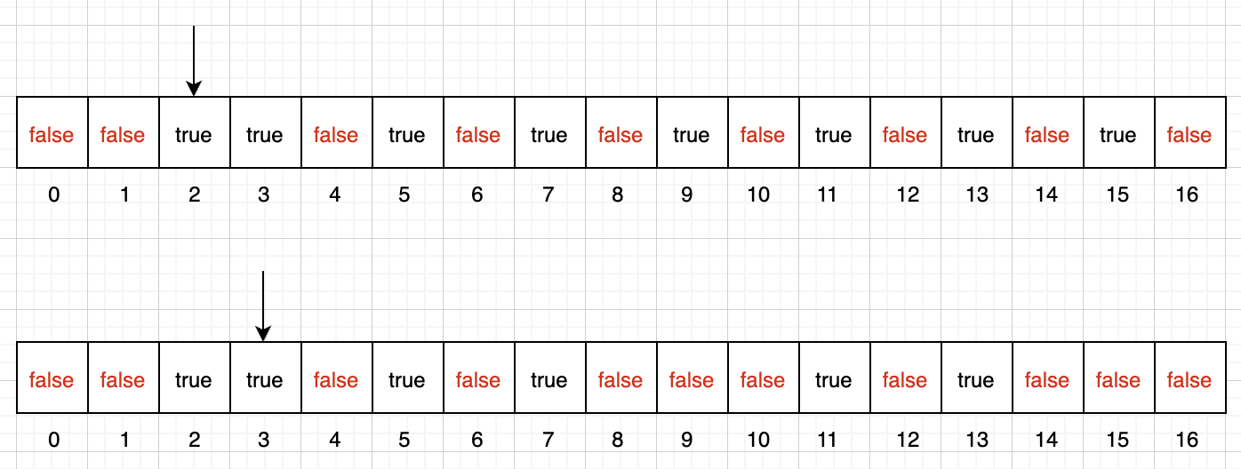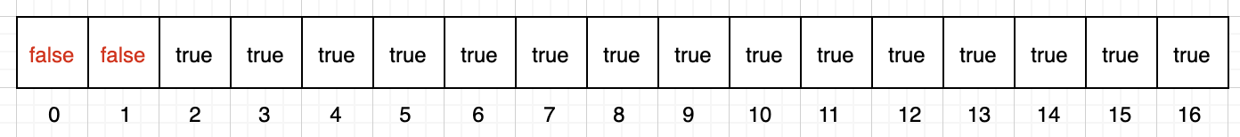 2. 인덱스 2부터 시작해서 N의 제곱근(=4)까지 해당 인덱스의 배수를 순차적으로 탐색한다. 값이 true라면 false로 바꿔준다.