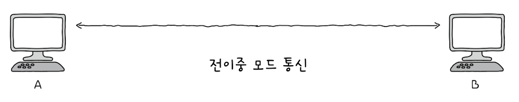 - 예를 들어 호스트 A가 B에게 메시지를 보내고 있을 때, 호스트 B는 A에게 동시에 메시지를 보낼 수 없다.