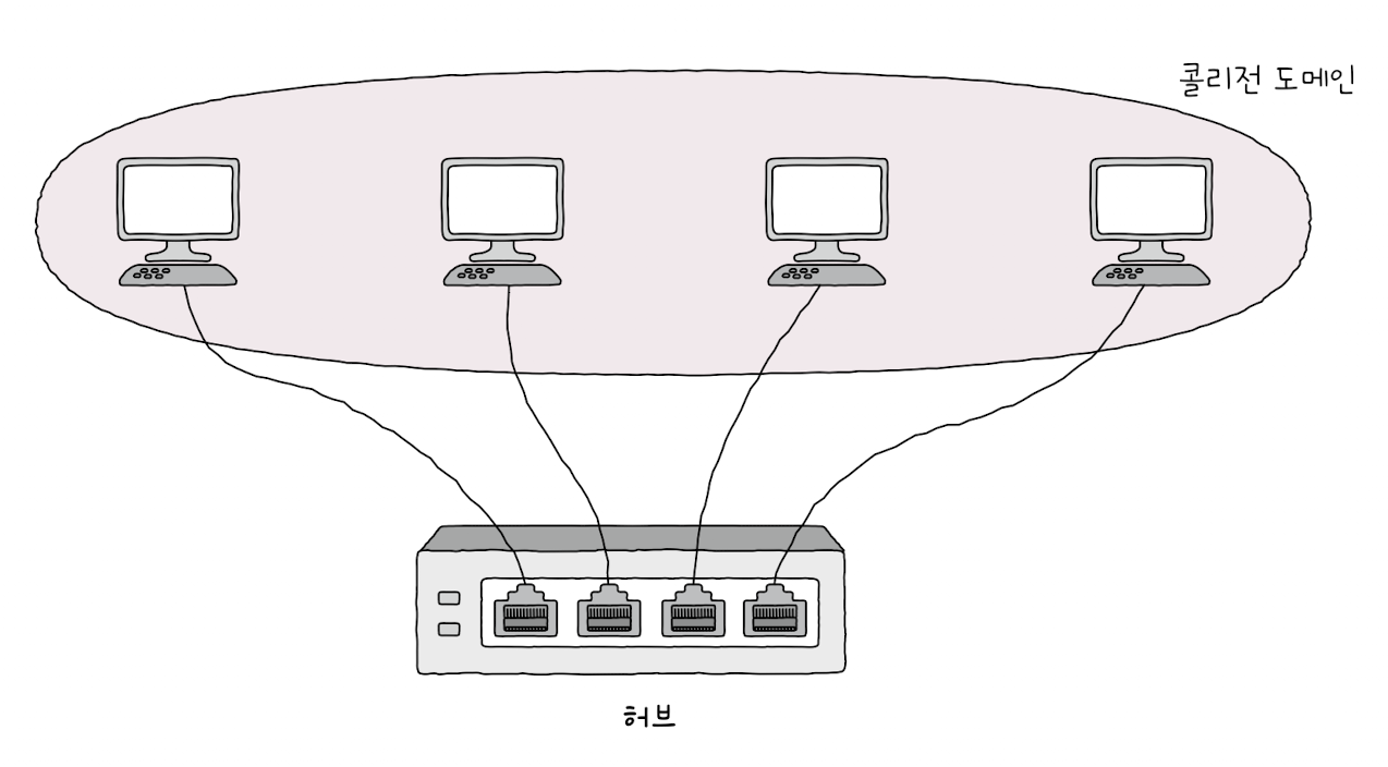 이는 여러 호스트가 동시에 허브로 신호를 송신할 수 있기 때문이다. 이렇게 충돌이 발생할 수 있는 범위를 콜리전 도메인(collision domain)이라고 부르며, 허브에 연결된 모든 호스트는 동일한 콜리전 도메인에 속하게 된다.