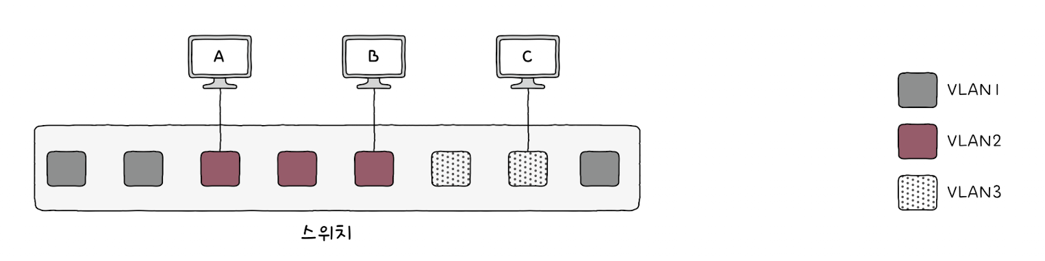 - 호스트 A와 B는 VLAN2를 할당한 포트에 연결되어 있으므로 같은 LAN에 속한 셈이다. 반면 호스트 C는 VLAN3에 속해 있으므로 호스트 A, B와는 다른 LAN에 속한 셈이라고 할 수 있다.
