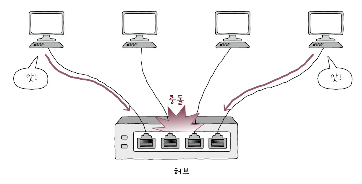 - 그런데 만약 두 호스트가 동시에 허브에 신호를 송신하면 어떻게 될까? 이 경우 충돌(collision), 즉 콜리전이 발생하게 된다.