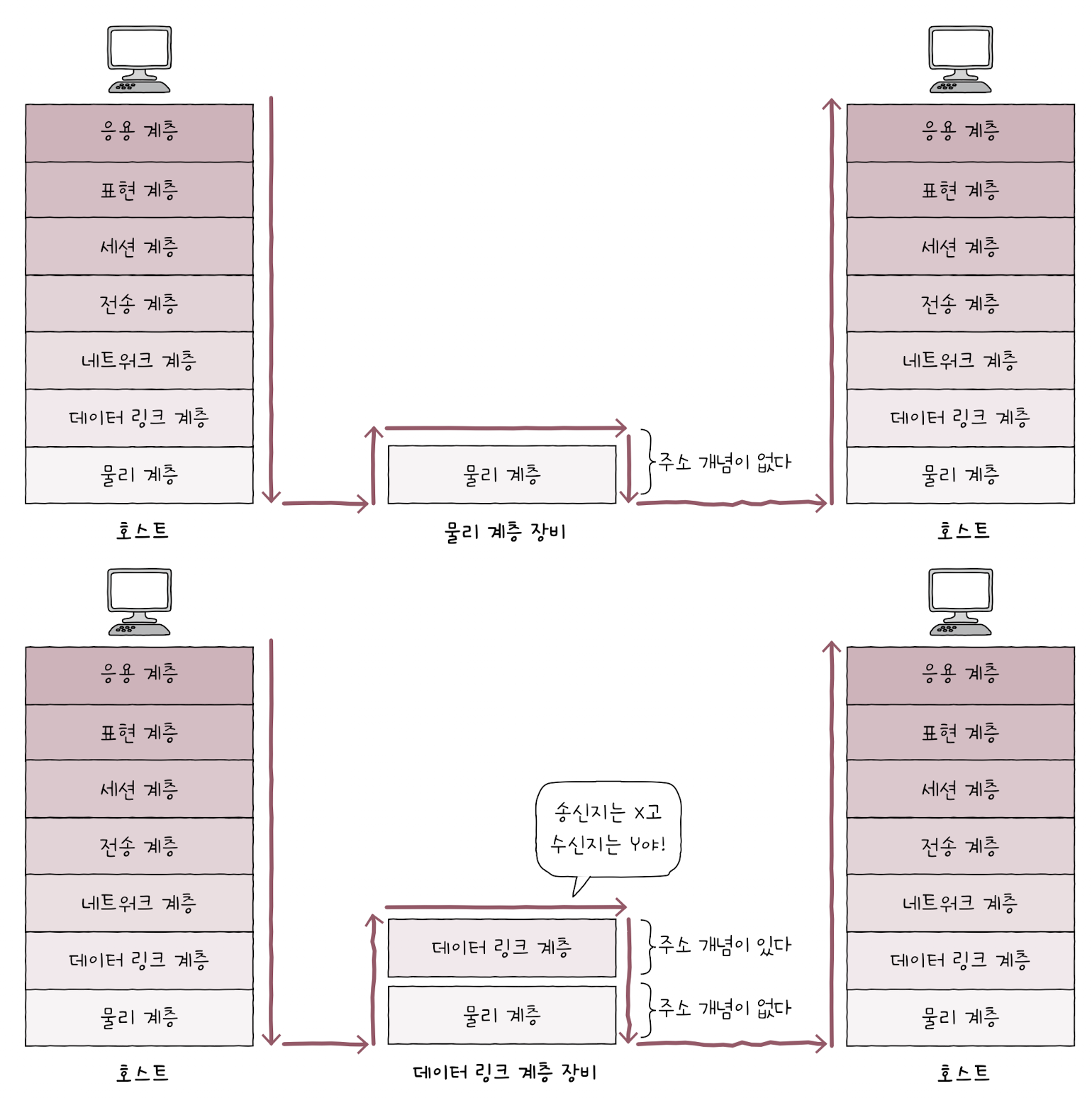 물리 계층에는 주소 개념이 존재하지 않는다는 점이다. 송수신지를 특정할 수 있는 주소는 데이터 링크 계층부터 존재하는 개념이다.