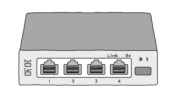 - 허브가 어떻게 생겼는지 살펴보면, 커넥터를 연결할 수 있는 네 개의 연결 지점이 보인다. 이를 포트(port)라고 하며, 각 포트에는 호스트와 연결된 통신 매체를 연결할 수 있다.