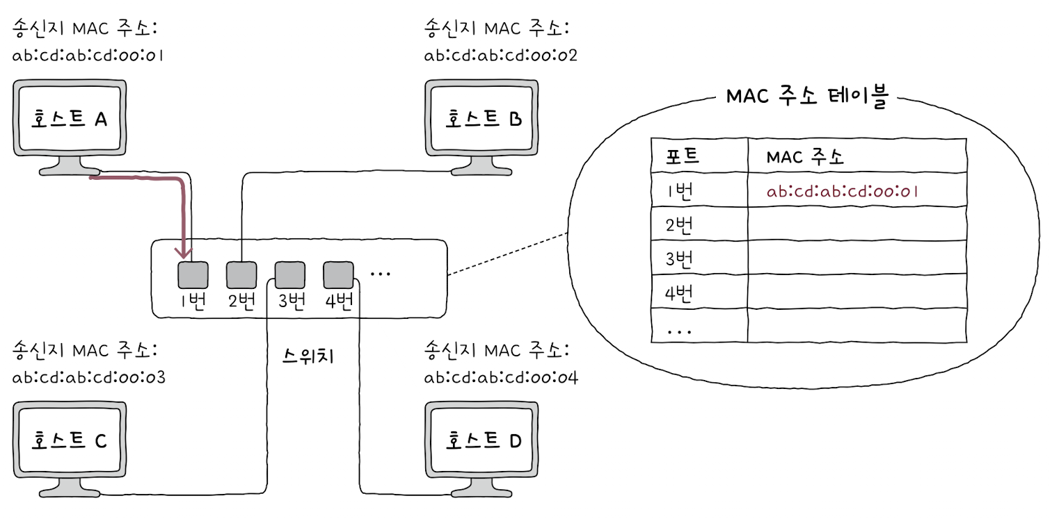 - 스위치의 가장 중요한 특징은 각 포트에 연결된 호스트의 MAC 주소와의 관계를 기억한다는 점이다. 이 기능 덕분에 스위치는 목적지 호스트에만 프레임을 전달할 수 있다. 이러한 동작을 MAC 주소 학습(MAC address learning)이라고 부른다.