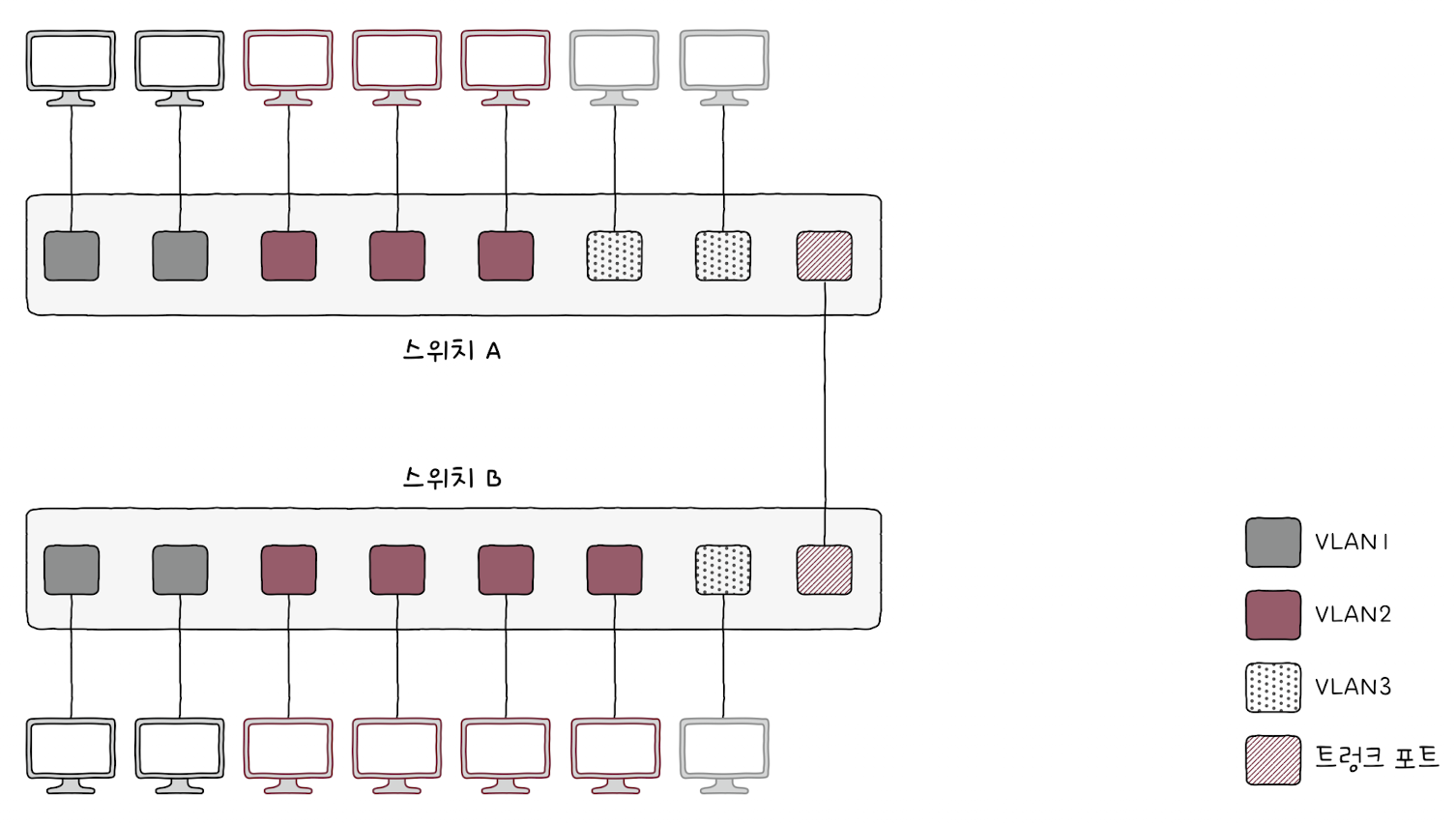 다음 그림을 보면, 트렁크 포트를 통해 스위치 A와 스위치 B가 연결된 것을 볼 수 있다.