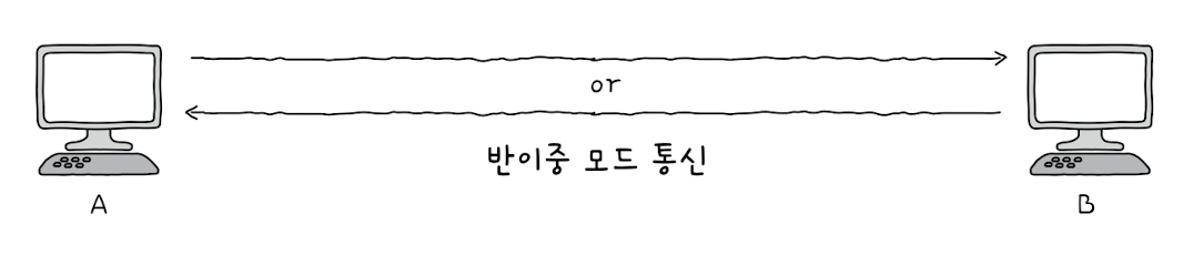 - 예를 들어 호스트 A가 B에게 메시지를 보내고 있을 때, 호스트 B는 A에게 동시에 메시지를 보낼 수 없다.