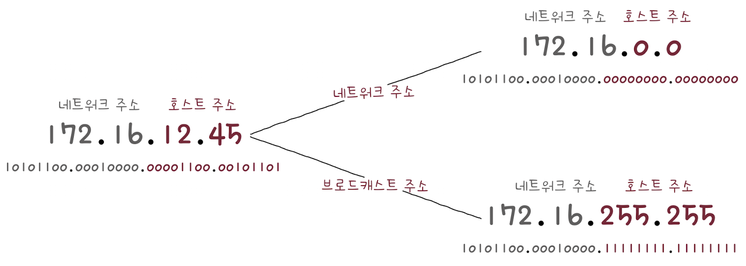 호스트의 주소 공간을 모두 사용할 수 있는 것은 아니다. 호스트 주소가 전부 0인 IP 주소와 호스트 주소가 전부 1인 IP 주소는 특정 호스트를 지정하는 IP 주소로 활용할 수 없다. 전자는 해당 네트워크 자체를 의미하는 네트워크 주소로 사용되고, 후자는 브로드캐스트를 위한 주소로 사용되기 때문이다.