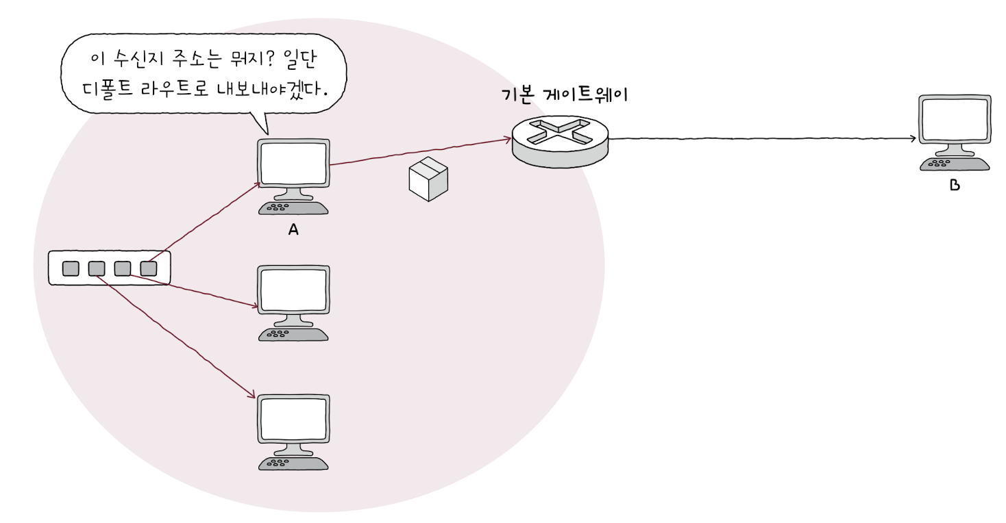 - 이를 위해 A는 라우터 주소인 기본 게이트웨이를 디폴트 라우트로 삼는다.