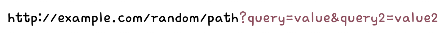 쿼리 문자열은 물음표(?)로 시작되는 ‘키=값’ 형태의 데이터로, 앰퍼샌드(&)를 사용하여 여러 쿼리 문자열을 연결할 수 있다. 다음은 query=value, query2=value2라는 쿼리 문자열이 포함된 URL 예시이다.