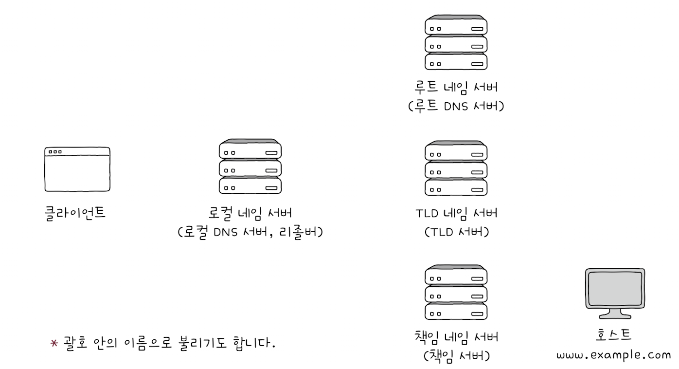 이 과정에서 다양한 네임 서버들이 사용되는데, 중요한 역할을 담당하는 네임 서버의 유형은 크게 네 가지가 있다. 각각 ‘로컬 네임 서버’, ‘루트 네임 서버’, ‘TLD(최상위 도메인) 네임 서버’, ‘책임 네임 서버’이다.