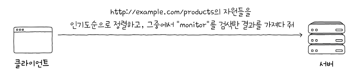 예를 들어, 수많은 정보 중에서 ‘특정 단어를 검색한 결과’에 해당하는 자원이나 수많은 상품 중에서 ‘특정 상품을 검색한 뒤 그 결과를 내림차순으로 정렬한 결과’에 해당하는 자원을 scheme, authority, path만으로 모두 표현하기란 어렵다.