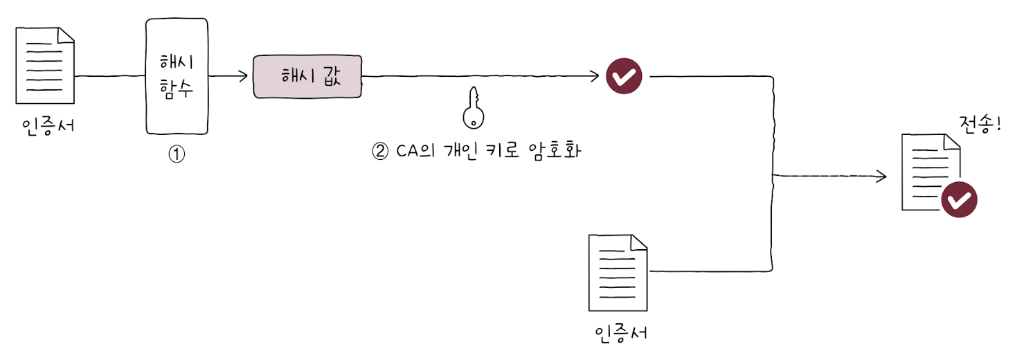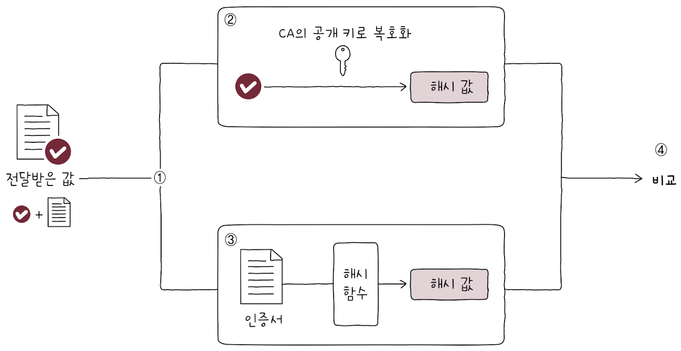 클라이언트는 서버로부터 받은 인증서의 서명 값을 인증서에서 제공하는 CA의 공개 키로 복호화하여 해시 값을 얻고, 동시에 인증서의 실제 내용으로부터 새롭게 해시 값을 계산한 후 두 값을 비교한다