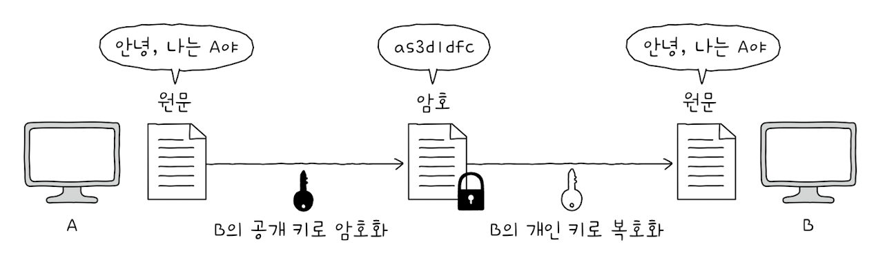 예를 들어 A가 B에게 메시지를 보낼 때는 B의 공개 키로 암호화하고, B는 자신의 개인 키로 이를 복호화하며, 반대로 B가 A에게 메시지를 보낼 때도 동일한 방식으로 진행된다.