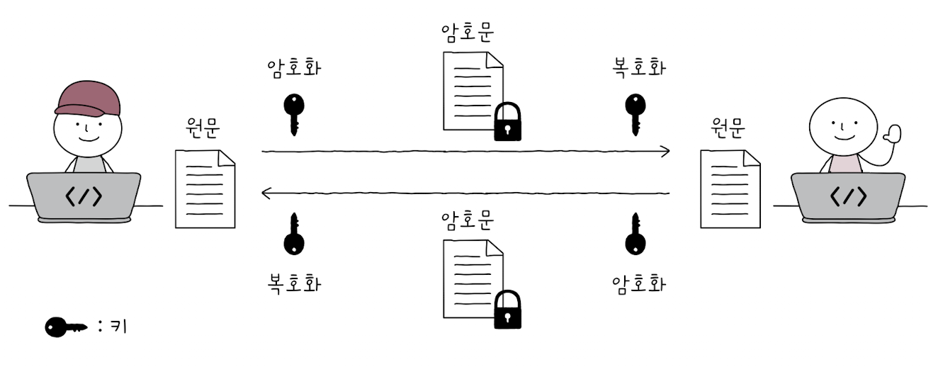 복호화(decryption): 암호화된 데이터를 원문 데이터로 되돌리는 것을 의미