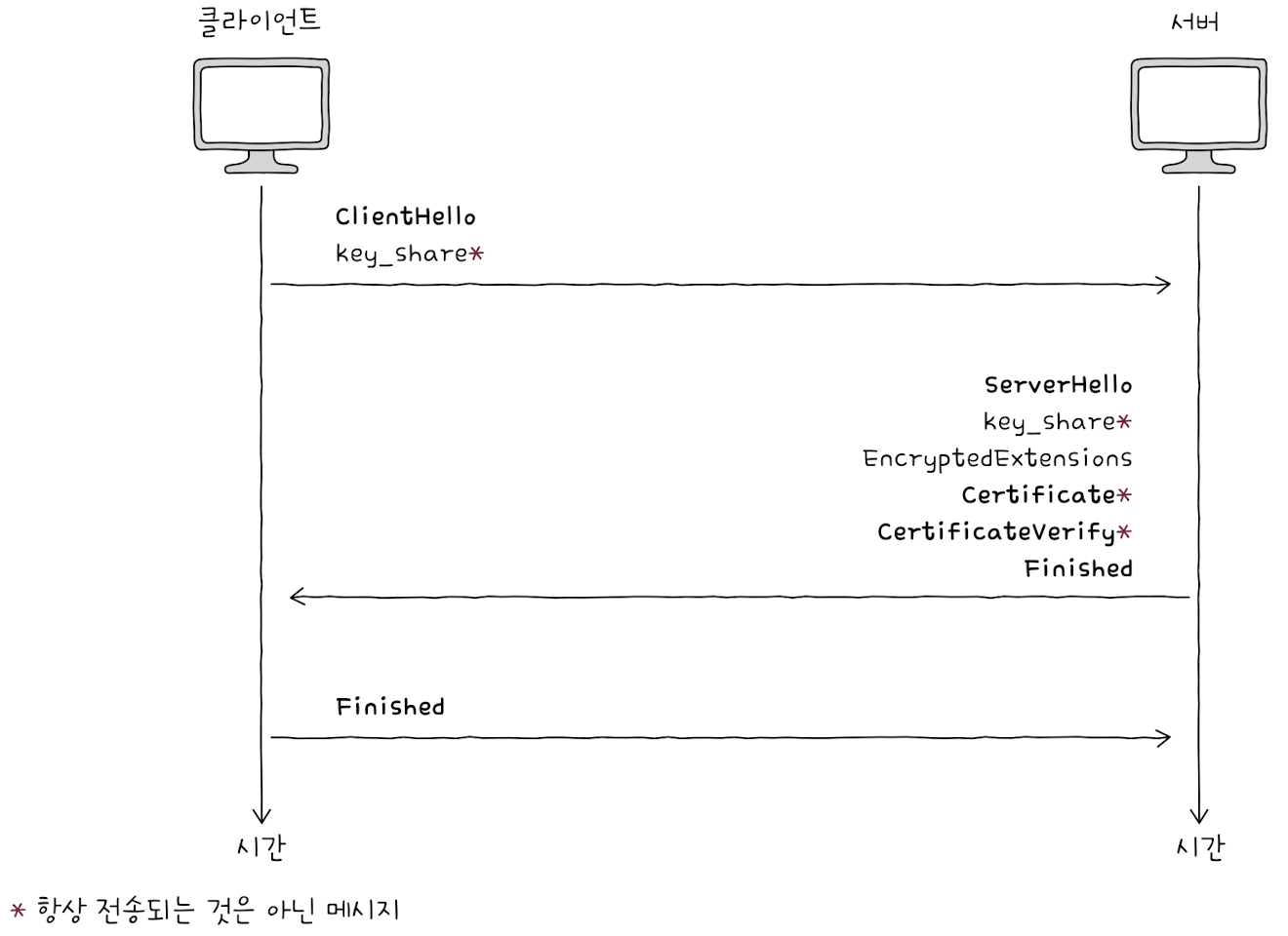 TLS 핸드셰이크는 인증서 송수신과 키 교환이 핵심이다.