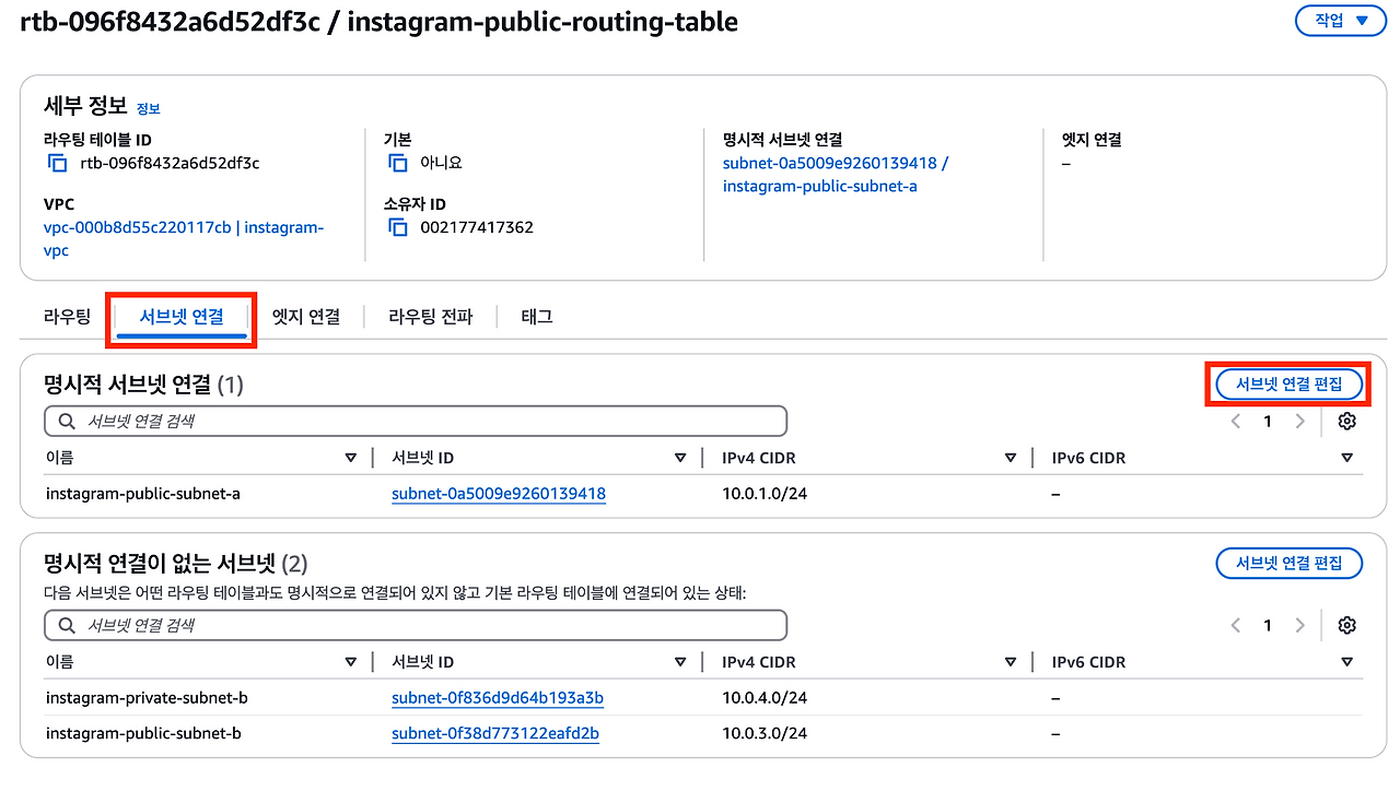 6. 퍼블릭 라우팅 테이블에 퍼블릭 서브넷 연결
