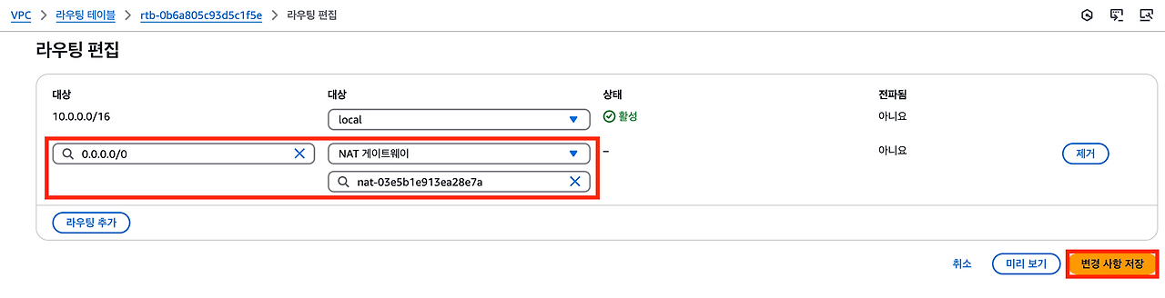 - 기존 라우팅 테이블은 ap-northeast-2a의 가용 영역에 있는 NAT 게이트웨이로 라우팅을 하고 있다.