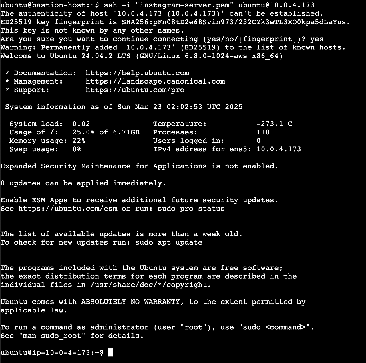 $ ssh -i "instagram-server.pem" ubuntu@[instagram-server-b 인스턴스의 Private IP]