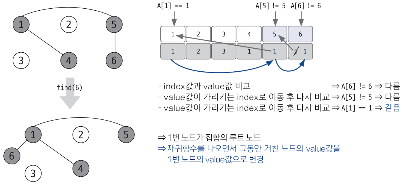 find 연산 : 두 노드가 같은 집합에 속해 있는지를 확인하는 연산