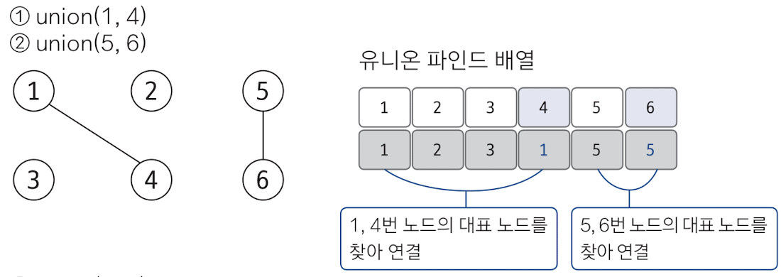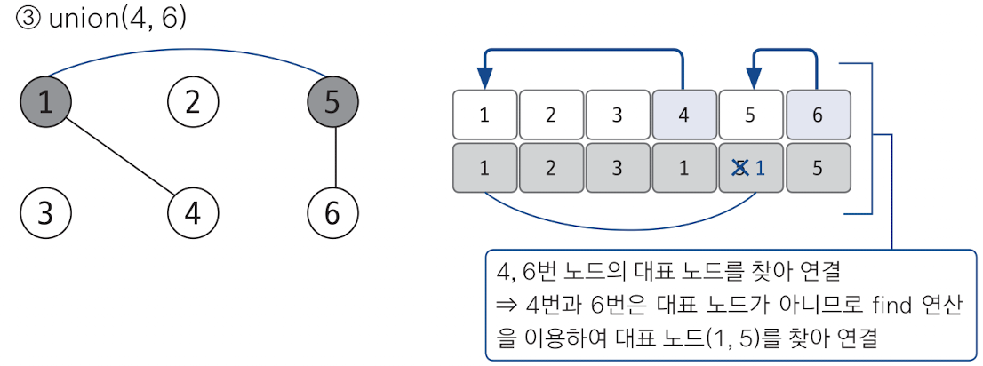 4의 대표 노드에 1에 6의 대표 노드 5를 연결한다. -> union(1, 5)