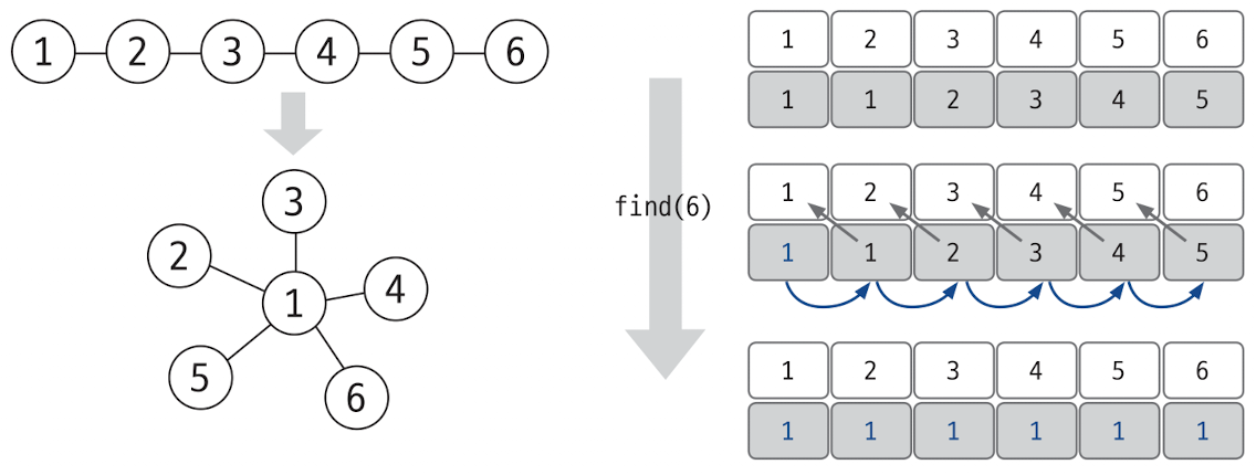 한 번의 find 연산을 이용해 모든 노드가 루트 노드에 직접 연결되는 형태로 변경되는 것을 볼 수 있다. 이러한 형태로 변경되면 이후 find 연산이 진행될 때 경로 압축의 효과가 나타난다.