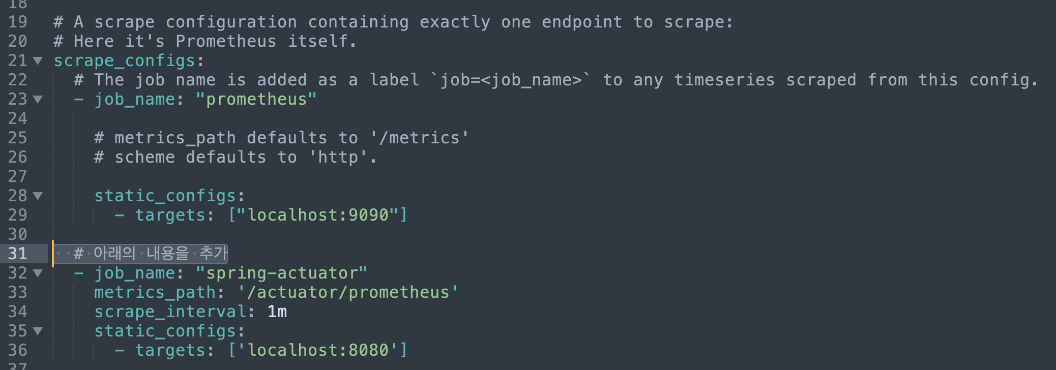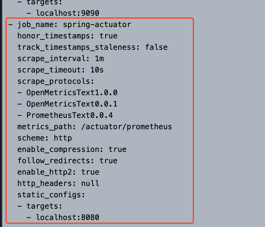 프로메테우스 메뉴 -> Status -> Configuration 에 들어가서 prometheus.yml 에 입력한 부분이 추가되어 있는지 확인