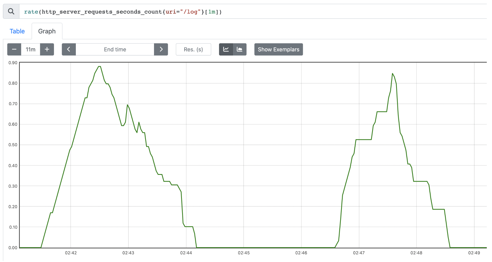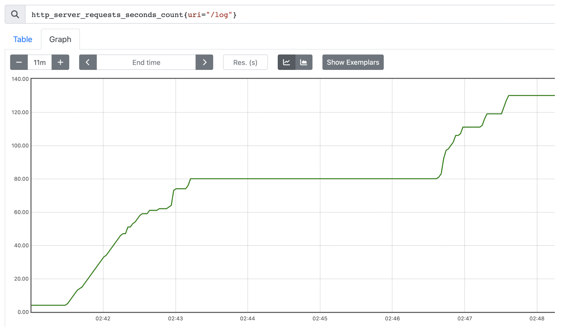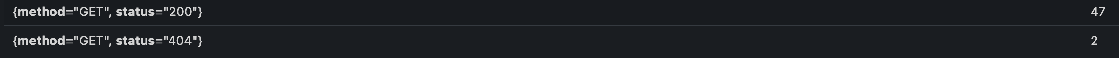 uri=/log , method=GET 조건으로 필터 : http_server_requests_seconds_count{uri="/log", method="GET"}