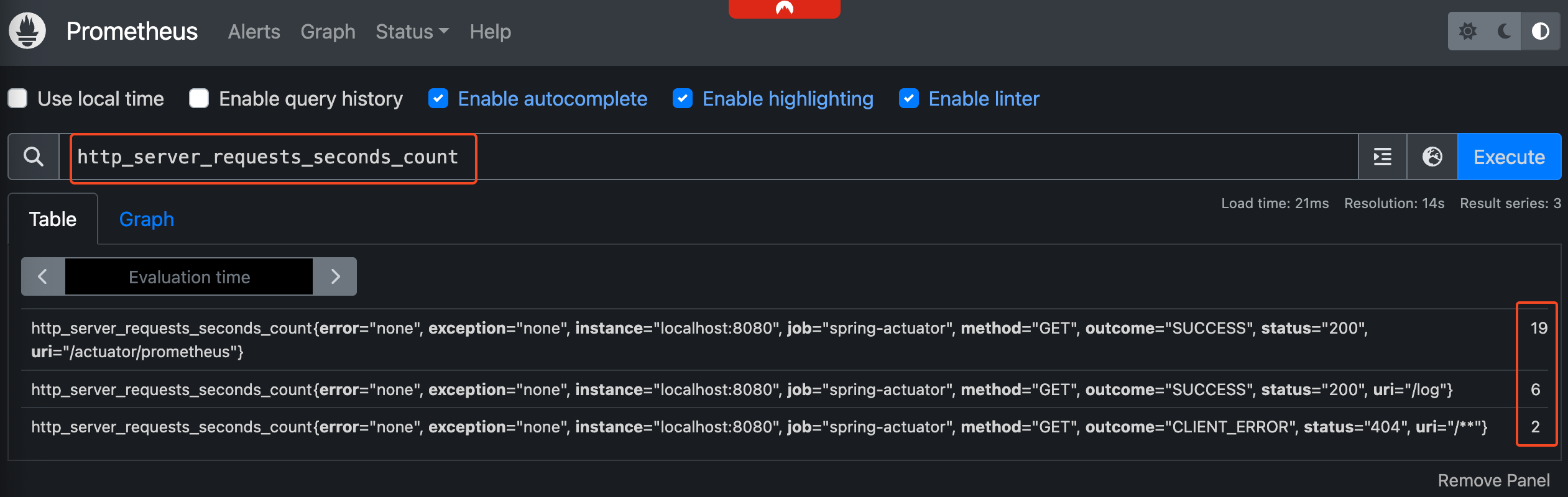 검색창에 http_server_requests_seconds_count 를 입력하고 실행