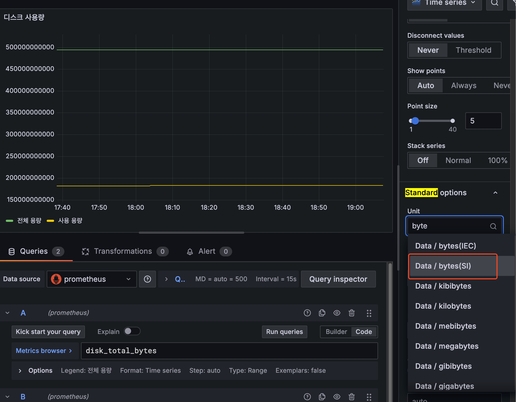 마지막에 [1m], [60s] 와 같이 표현한다. 지난 1분간의 모든 기록값을 선택한다.