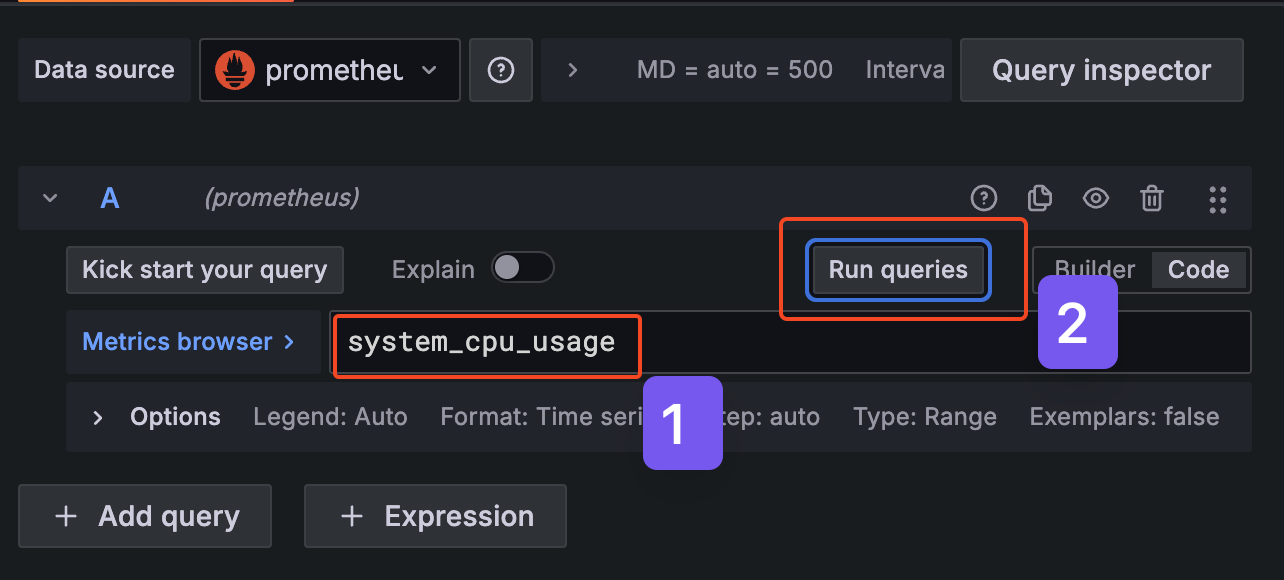 /actuator/prometheus 는 제외한 조건으로 필터 : http_server_requests_seconds_count{uri!="/actuator/prometheus"}
