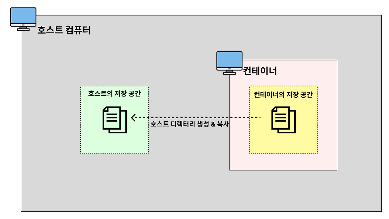 [호스트의 디렉토리 절대 경로]에 디렉토리가 존재하지 않을 경우, 호스트의 디렉터리 절대 경로에 디렉터리를 새로 만들고 컨테이너의 디렉터리에 있는 파일들을 호스트의 디렉터리로 복사해온다.