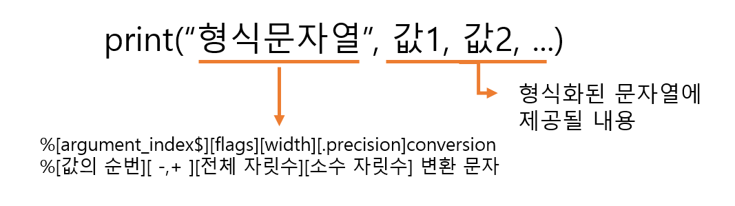 print("형식문자열"); -> 어렵게 생각할 필요 없다. 보통 첫 프로그래밍 언어로 C언어를 먼저 배우니 C언어에서 출력할 때 사용했던 문법과 거의 유사하다.