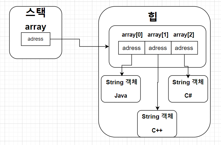 기본 타입(byte, int등등) 배열은 각 항목에 직접 값을 갖고 있지만, 참조타입(클래스, 인터페이스) 배열은 각 항목에 객체의 번지를 가지고 있다. 예를 들어 String은 클래스이므로 String[]배열은 각 항목에 문자열이 아니라, String 객체의 번지를 가지고 있다. 즉 String[] 배열은 String 객체를 참조하게 된다.